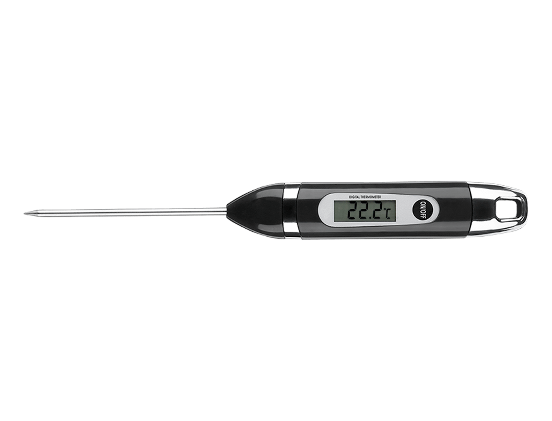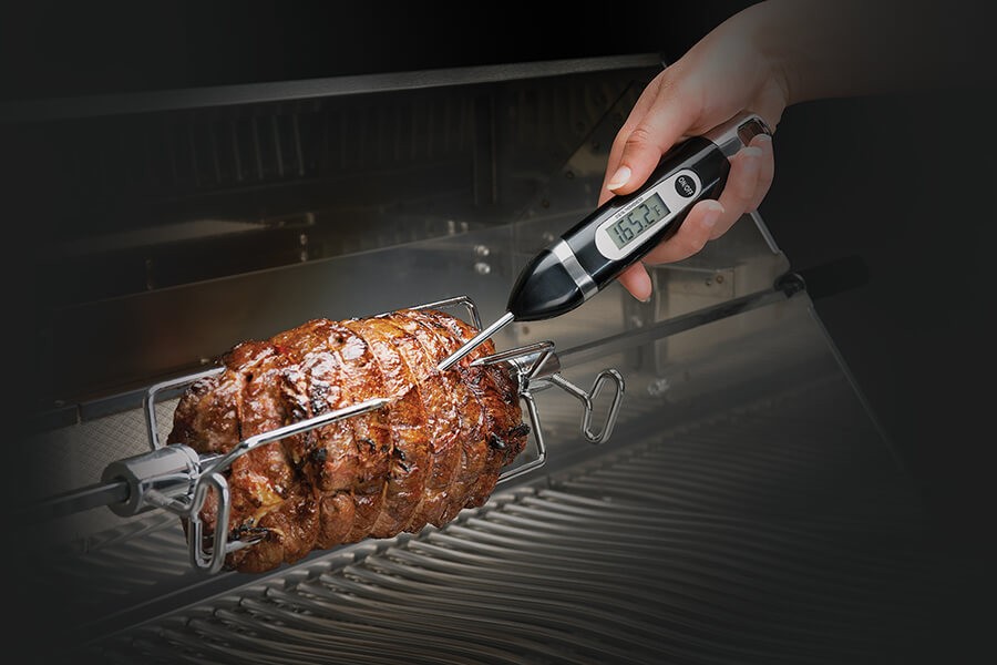 Digitální teploměr se sondou v podobě jehly užijete nejen při grilování, ale i při pečení masa v troubě nebo na pánvi. Hrot stačí zapíchnout do středu masa a během pár vteřin zjistíte, jakou teplotu má uvnitř. Teploměr omývejte vždy pouze mýdlovou vodou, rozhodně nepatří do myčky.
