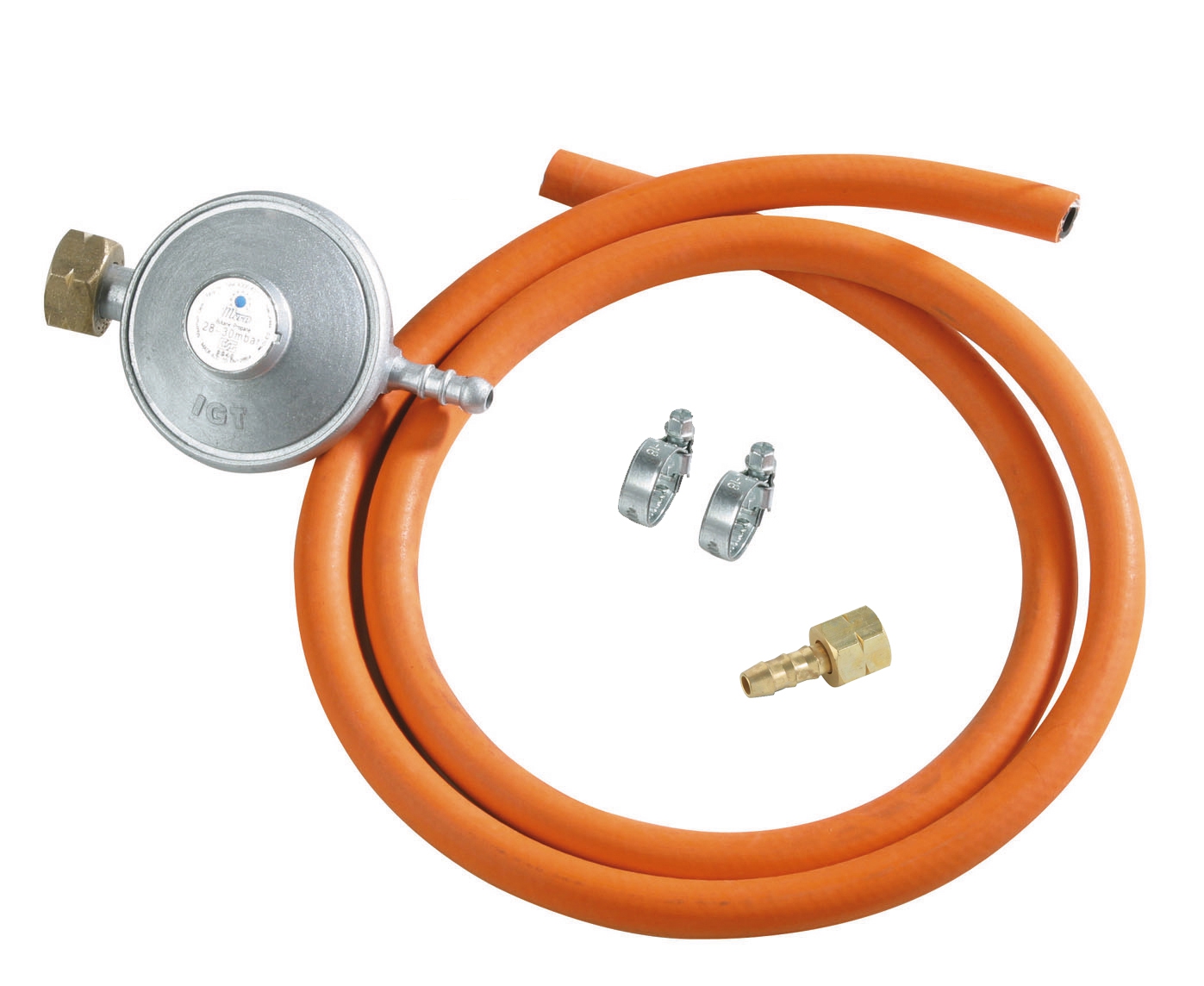 Regulátor je 30 mBar, průtok 1 kg/h, délka hadice 1,5 m.